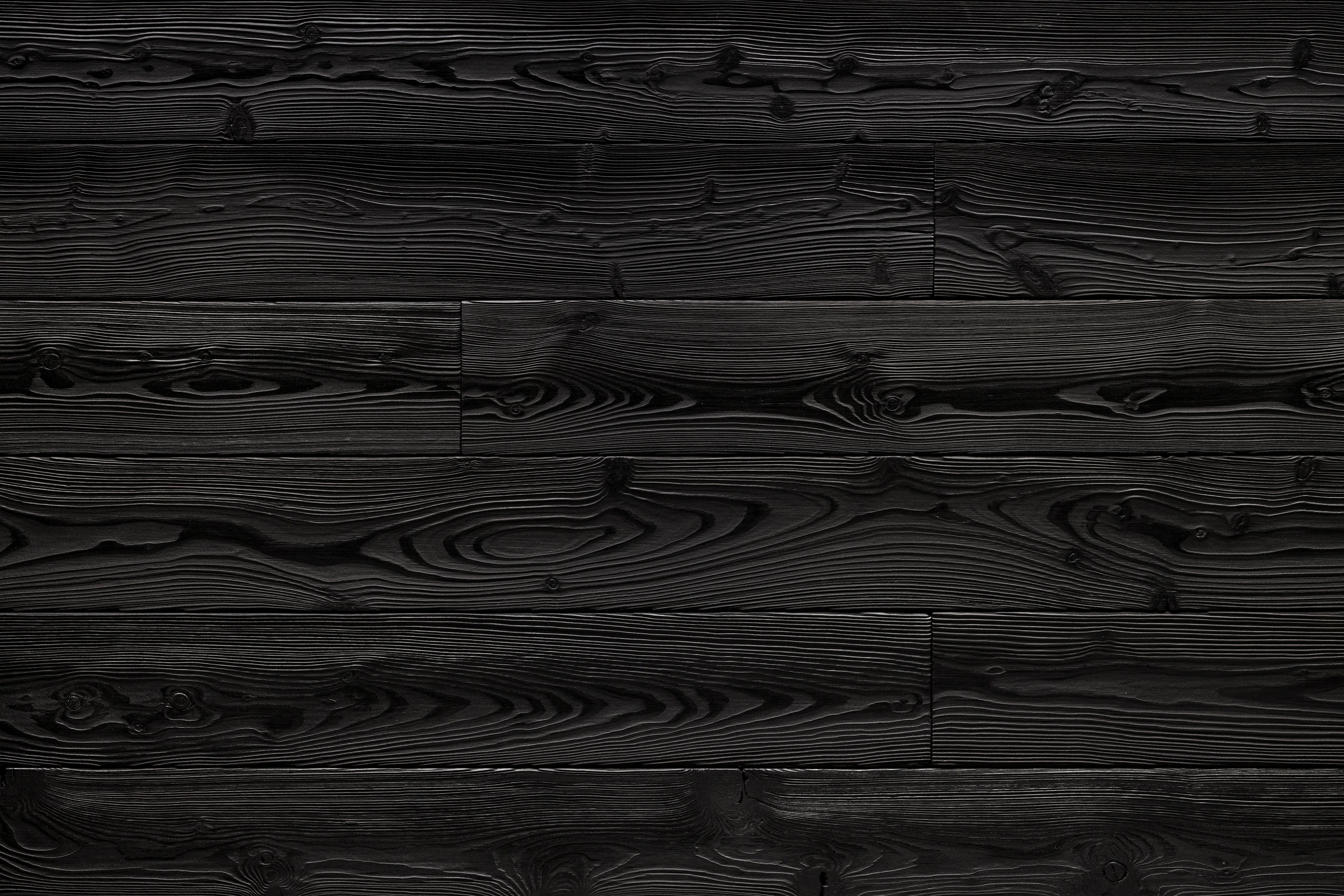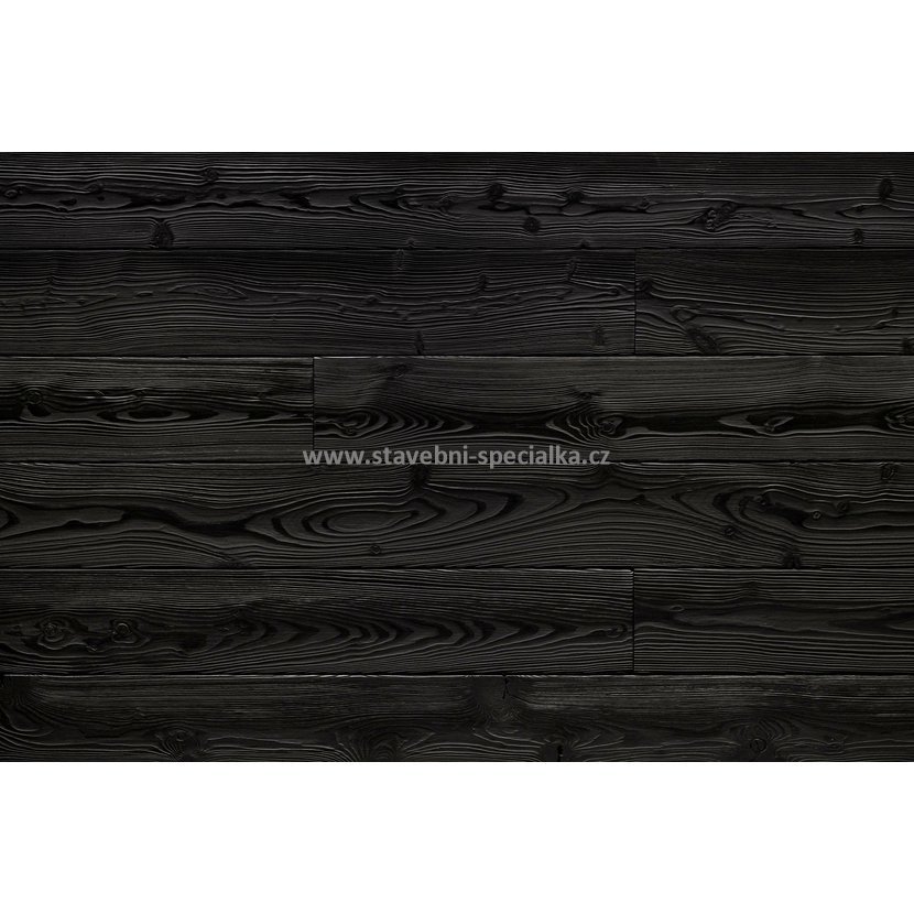 Dřevěný obklad z tepelně upraveného severského smrku (212°), povrch každého prkna je kartáčován a následně ošetřen černým nátěrem.